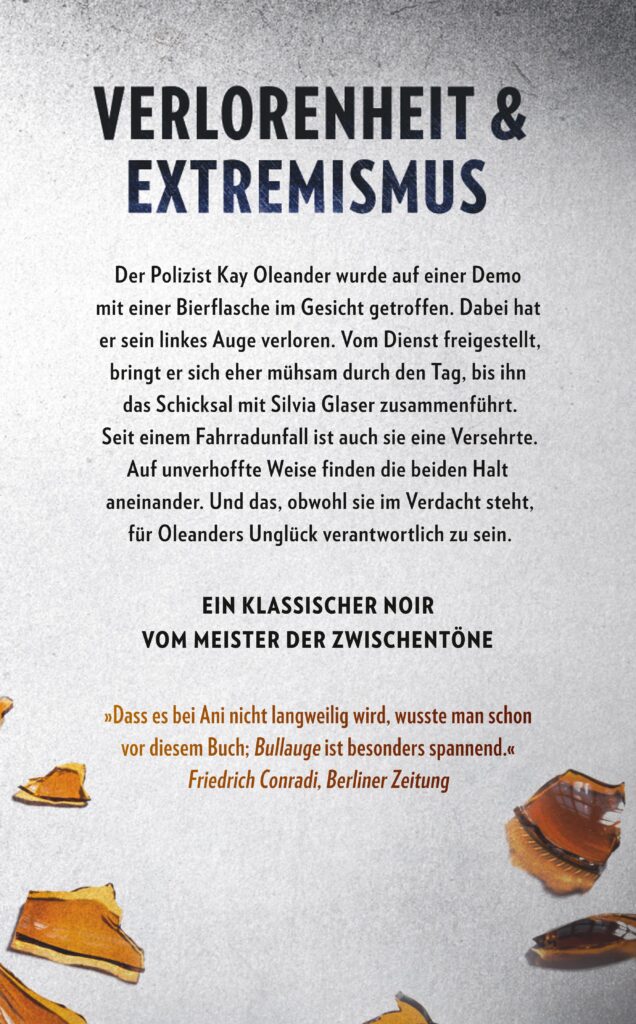 Der Polizist Kay Oleander wurde auf einer Demo mit einer Bierflasche im Gesicht getroffen. Dabei hat er sein linkes Auge verloren. Vom Dienst freigestellt, bringt er sich eher mühsam durch den Tag, bis ihn das Schicksal mit Silvia Glaser zusammenführt. Seit einem Fahrradunfall ist auch sie eine Versehrte. Auf unverhoffte Weise finden die beiden Halt aneinander. Und das, obwohl sie im Verdacht steht, für Oleanders Unglück verantwortlich zu sein. Silvia…