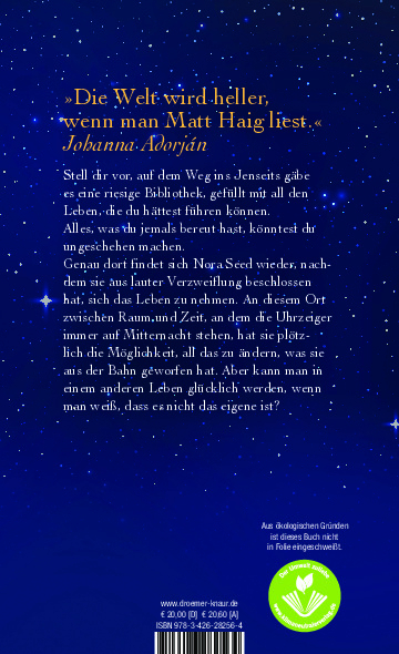 Stell dir vor, auf dem Weg ins Jenseits gäbe es eine riesige Bibliothek, gesäumt mit all den Leben, die du hättest führen können. Buch für Buch gefüllt mit den Wegen, die deiner hätten sein können.Hier findet sich Nora Seed wieder, nachdem sie aus lauter Verzweiflung beschlossen hat, sich das Leben zu nehmen. An diesem Ort, an dem die Uhrzeiger immer auf Mitternacht stehen, eröffnet sich für Nora plötzlich die Möglichkeit…