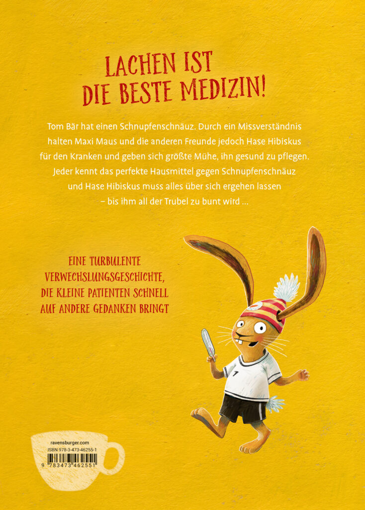 Bilderbuch-Hase Hibiskus weiß: Lachen ist die beste Medizin!Tom Bär hat eine Erkältung. Er fühlt sich schlapp und seine Nase läuft. Während er sich fragt, wohin die Nase denn läuft, besorgt Hase Hibiskus ihm Kräutertee und ein Erkältungsbad. Als Maxi Maus und die anderen Freunde auftauchen und fälschlicherweise Hase Hibiskus für den Kranken halten, ist das Chaos wieder einmal perfekt. Denn jeder kennt ein ganz besonderes Hausmittel, das gegen Schnupfenschnäuz hilft.…